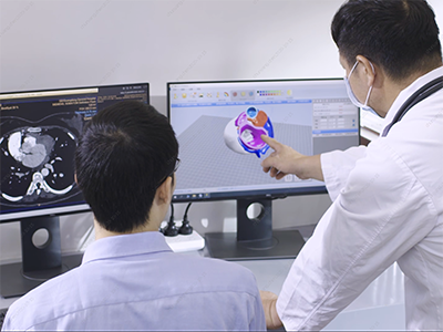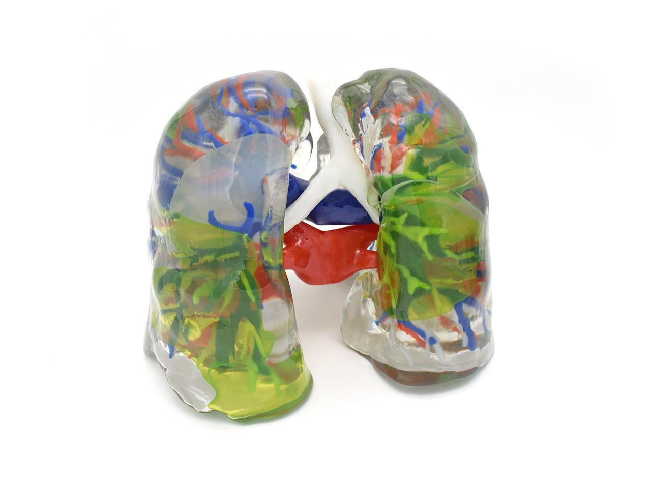 肺部是人体最复杂的脏器之一,根据CT或者PET-CT扫描等医疗检 查获得的患者数据,借助赛纳WJP直喷式彩色多材料3D打印技术打印出彩色、透明患者肺部模型,让医生在术前对整个器官和病灶有准确的了解,在手术中缩短探查时间,选择最合适的手术路径,清晰的判断病灶具体在肺部什么位置,病灶周围血管的走向等情况,更加精准地进行手术。